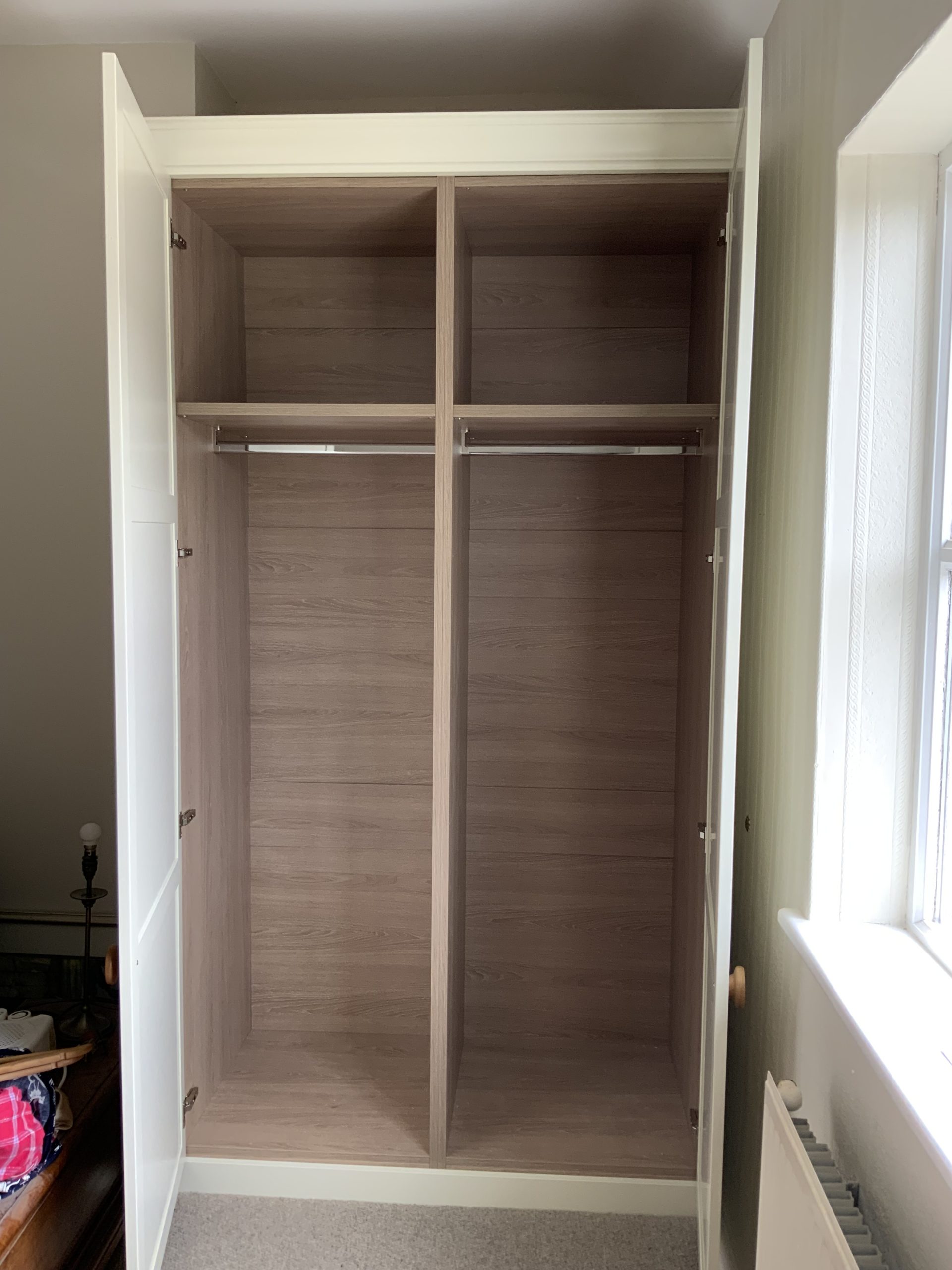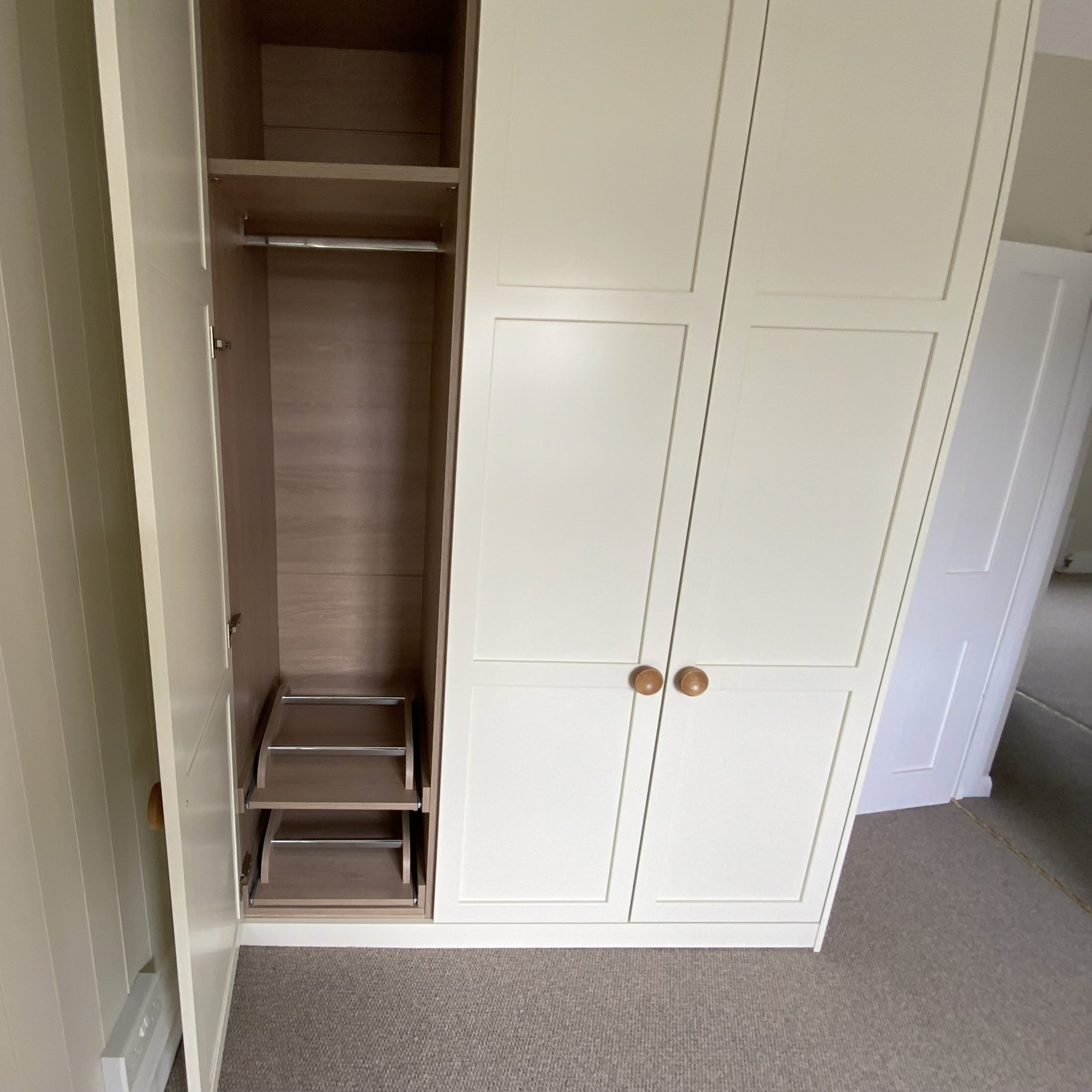 Crown Shenaya wardrobes in Oyster with Sand Oak Interiors installed into several upstairs bedrooms. We also laid a Wool Boucle Berber carpet into all the bedrooms and the downstairs lounge and study.