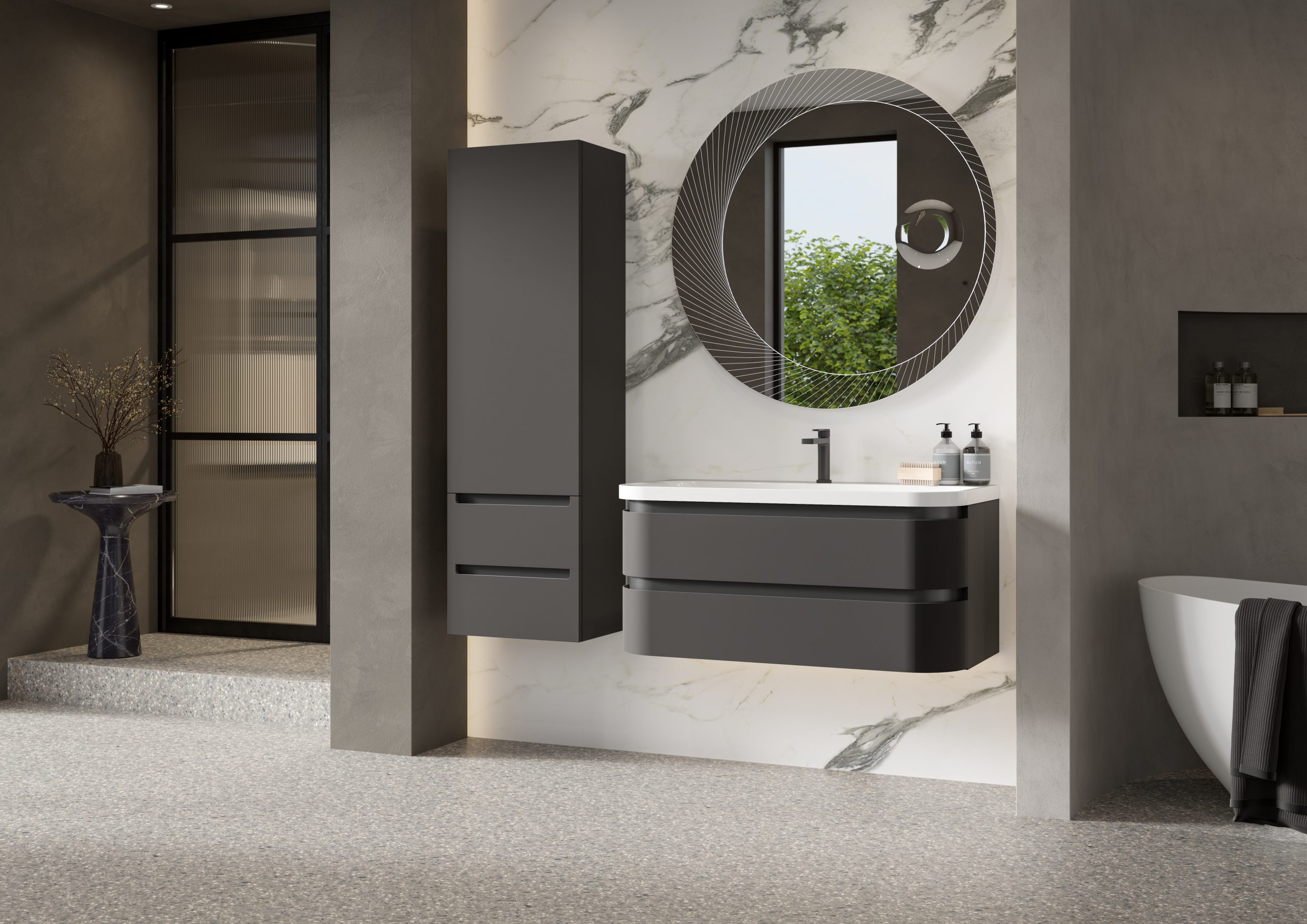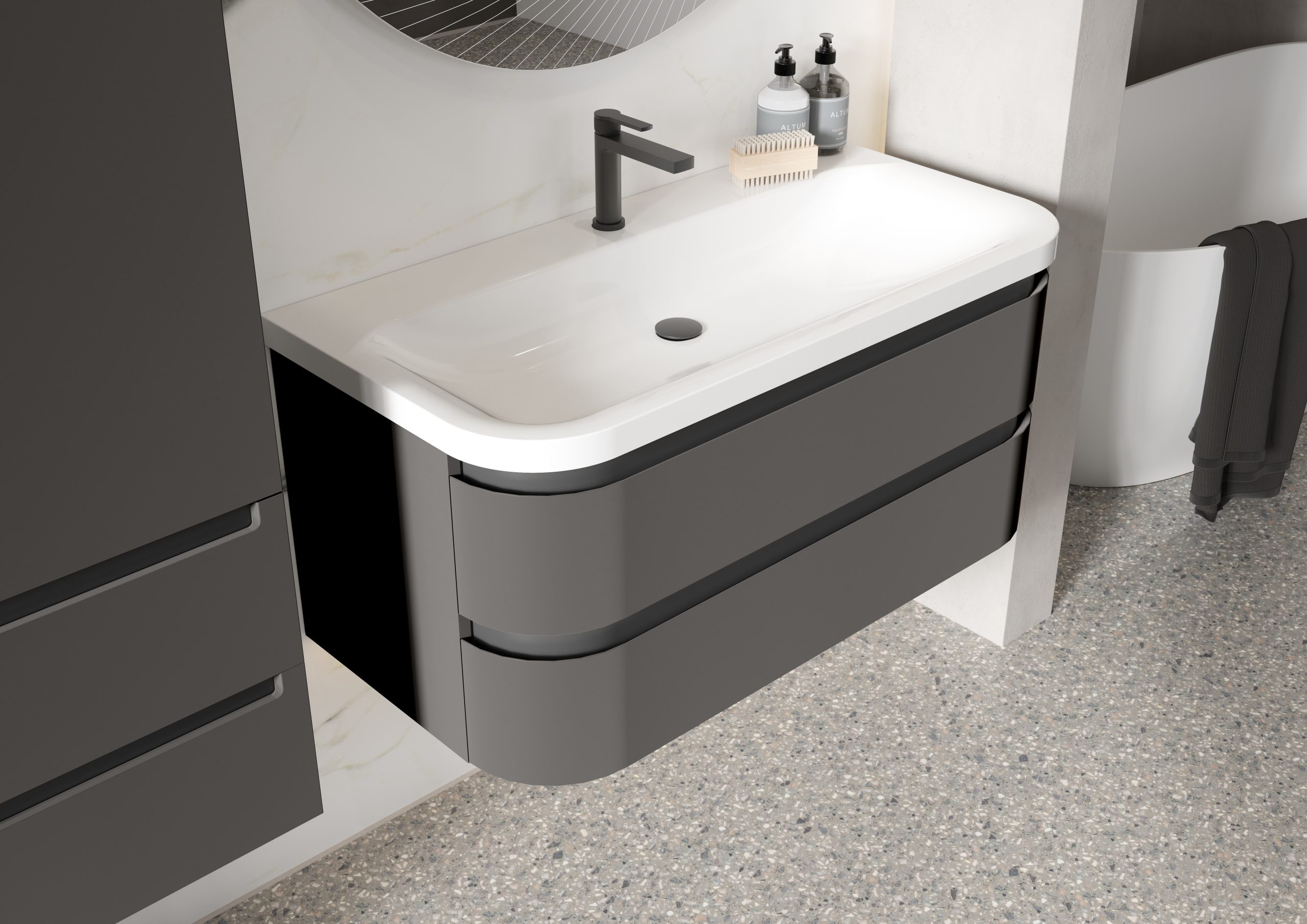 The Calypso Diamante Premium Vanity Furniture Range features beautful rounded corners with a matt black profile to suit any style of bathroom decor.