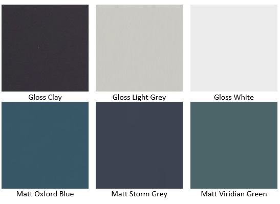 Available in a mixture of 6 Matt and Gloss finishes – Gloss White, Gloss Light Grey, Gloss Clay, Oxford Blue, Storm Grey and Viridian Green.